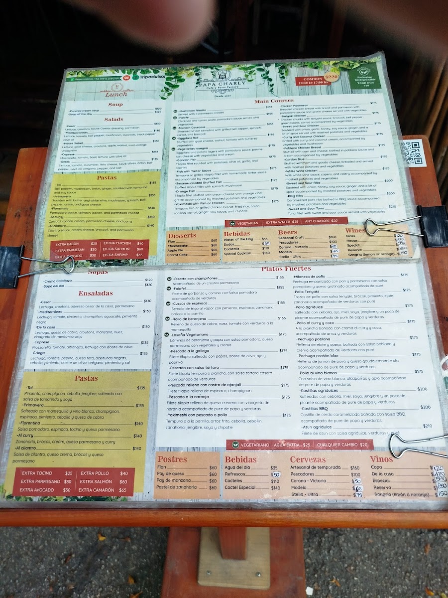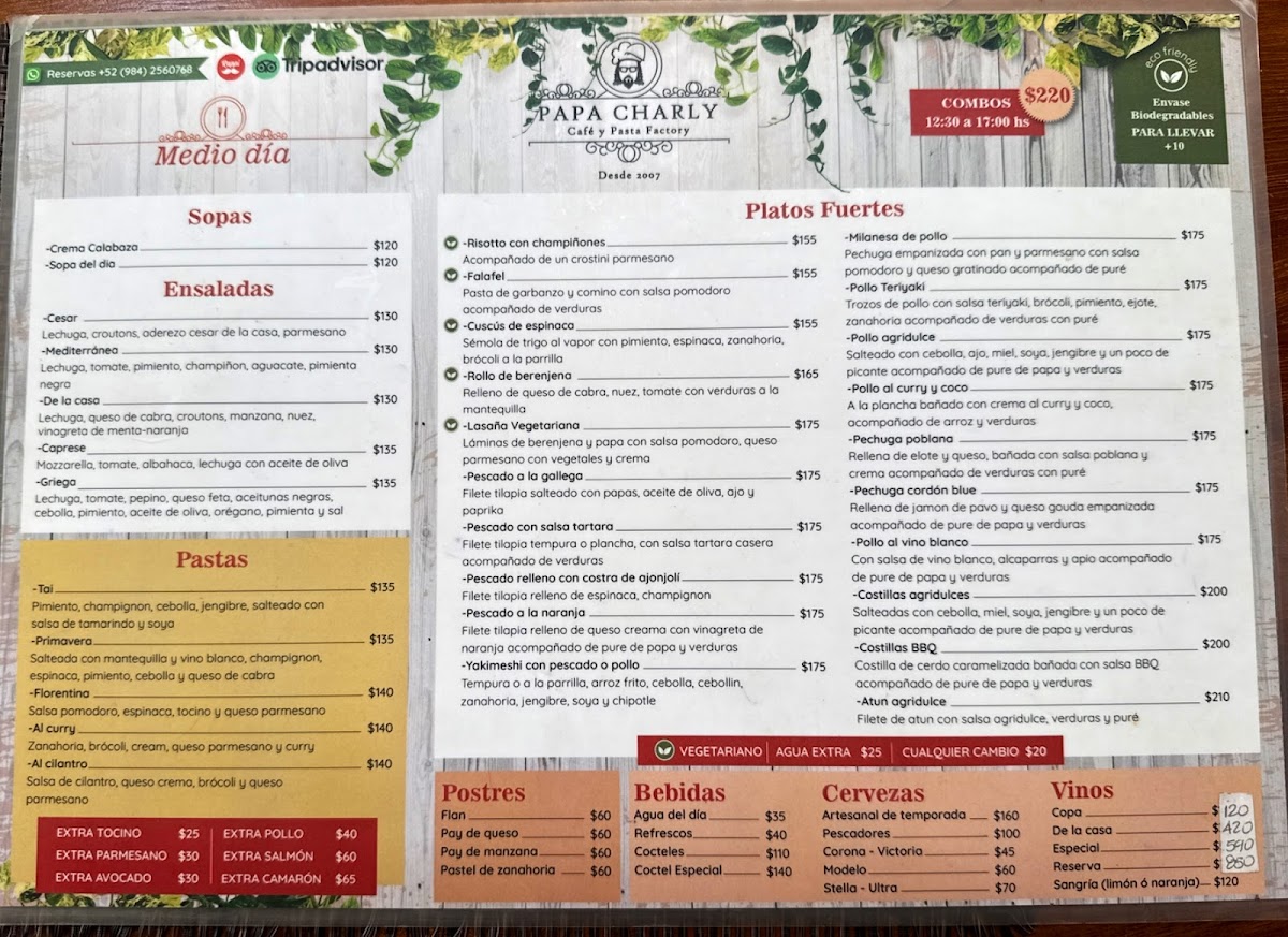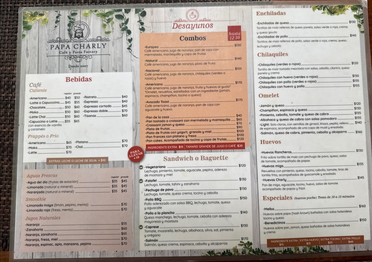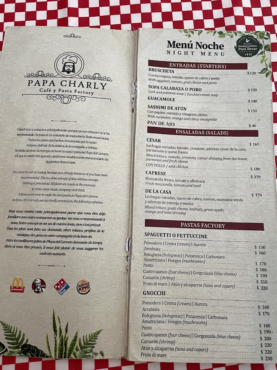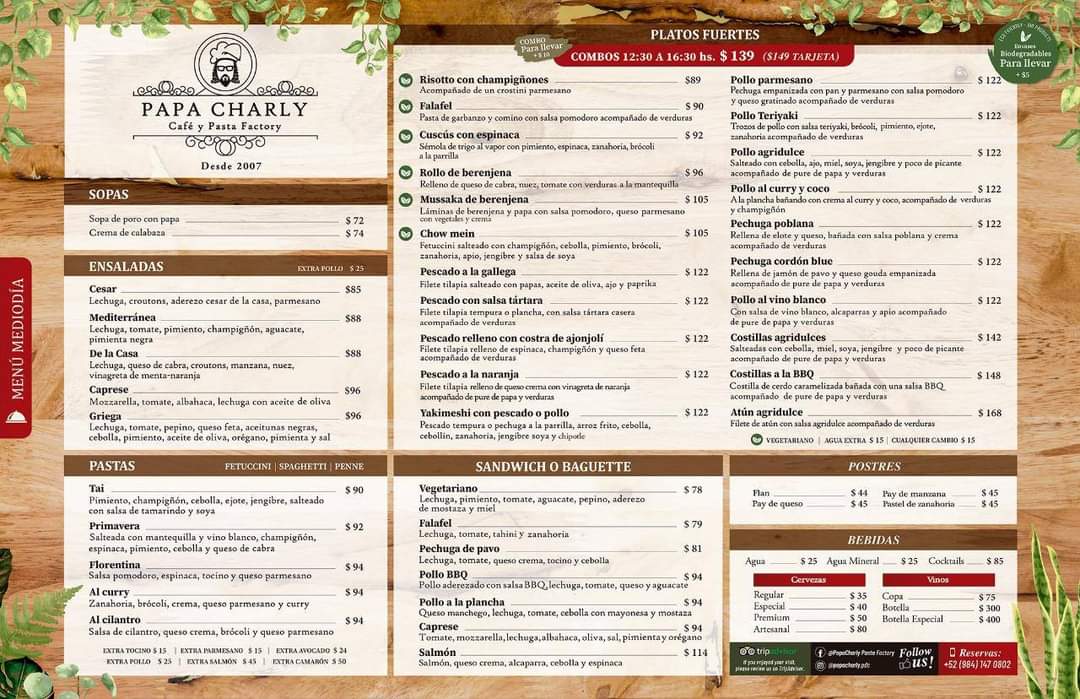 The menu at PapaCharly offers a variety of Italian dishes as well as selections inspired by other cuisines, suitable for different mealtimes including breakfast, lunch, and dinner. Visitors can choose from a range of appetizers, main courses, and desserts, complemented by beverages such as espresso and beer.