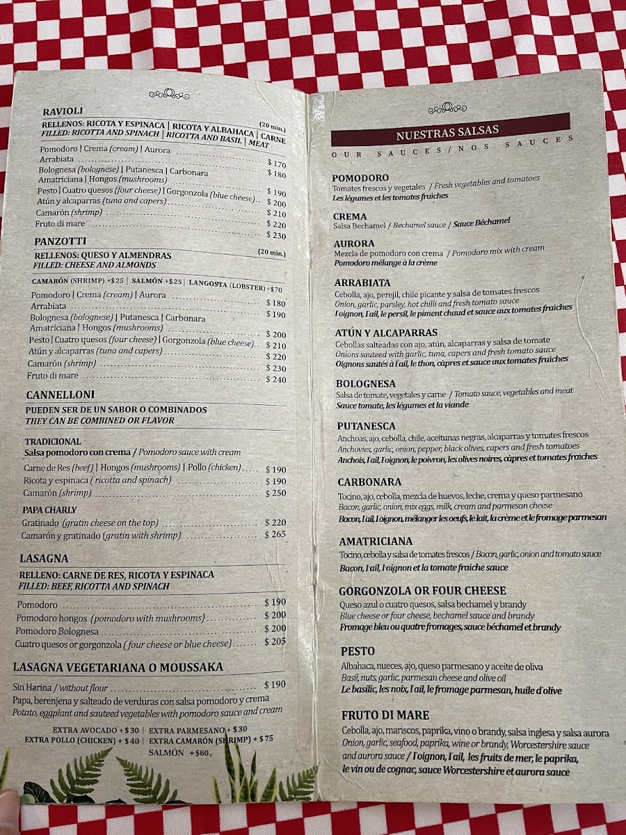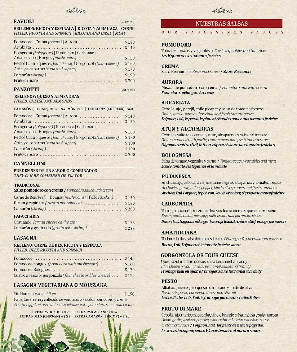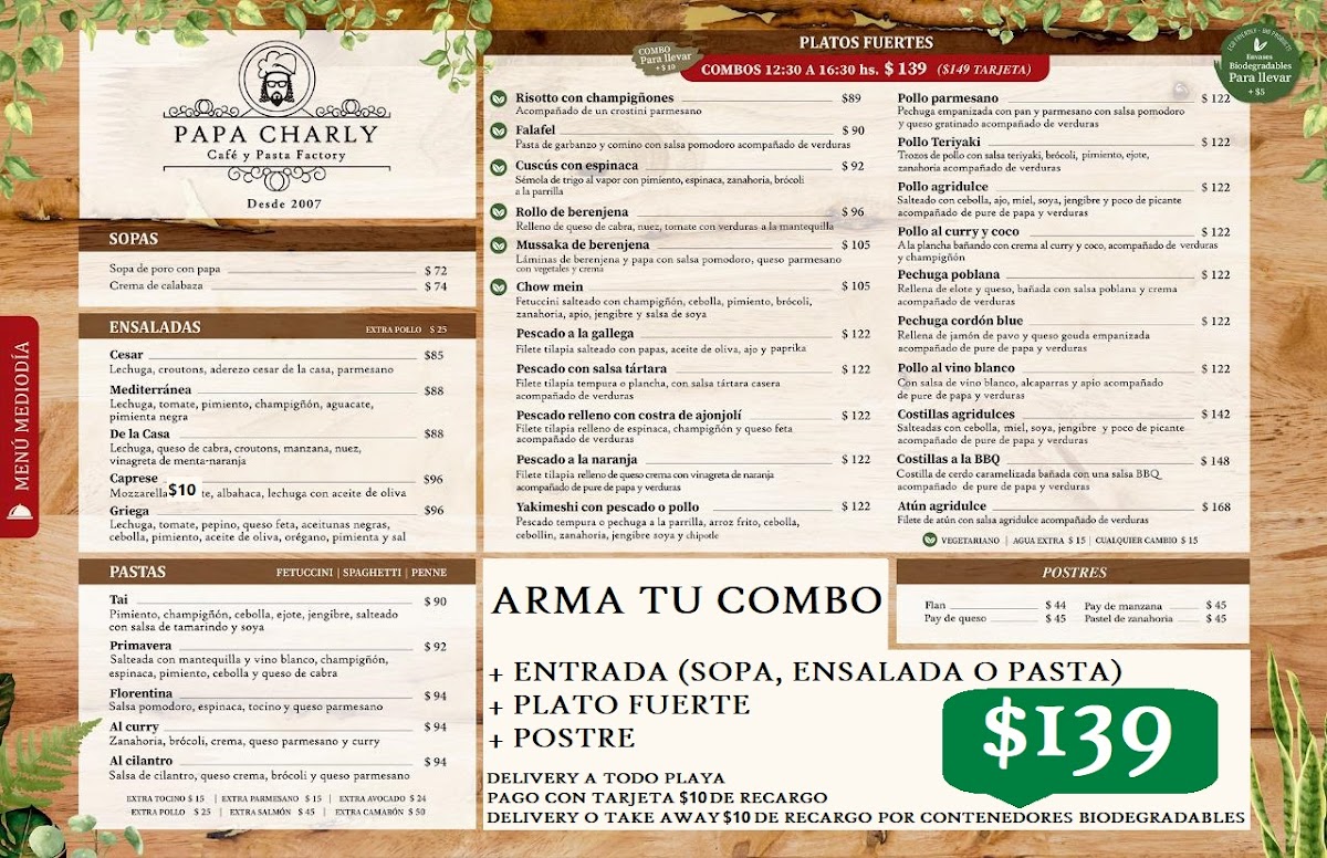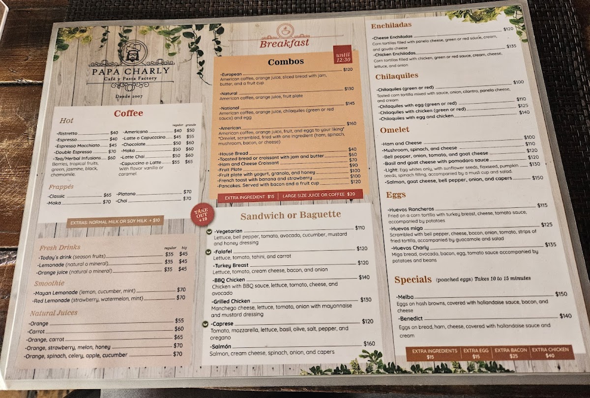 The menu at PapaCharly offers a variety of Italian dishes as well as selections inspired by other cuisines, suitable for different mealtimes including breakfast, lunch, and dinner. Visitors can choose from a range of appetizers, main courses, and desserts, complemented by beverages such as espresso and beer.